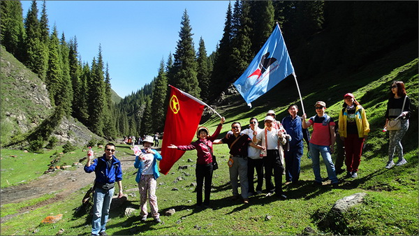 從喧囂的都市來到南山群山中風景優美的溝谷之一沙溝,這個位于北天山支脈北麓的山區,集中的展現著大美新疆的妙景。深邃的峽谷,蒼翠欲滴,在重峰疊嶂、唯有山羊才能攀巖上去的危崖聳立之處,一條蜿蜒的山道出其不意在期待著我們的步伐,眼前豁然開闊。在如茵的草坡,山花吐艷。白色的氈房點綴著一派綠色美景,不由得想起一句歌詞:氈房好似珍珠撒。盡管當今已難免的染上了一抹市場經濟的色彩,但當哈薩克牧民的羊群從我們徒步隊伍中穿過時,立馬提醒著后人,這個俊美的山區從唐代就曾是著名的牧區狩獵區,霎時有一種在時空中穿梭的感覺。