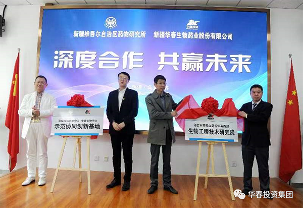 新疆華春生物藥業股份有限公司與自治區藥物研究所于4月 28日簽訂了深度合作協議,就雙方合作組建的新疆藥物研發中心華春生物藥業示范協同創新基地、烏魯木齊天山藥谷華春西部生物工程技術研究院舉行了揭牌。旨在更深層次多方面充分發揮雙方優勢,強強聯合,實現共贏。華春投資集團董事局李成功主席與自治區藥物研究所邢建國所長以及雙方的相關管理人員參加了簽約揭牌儀式。