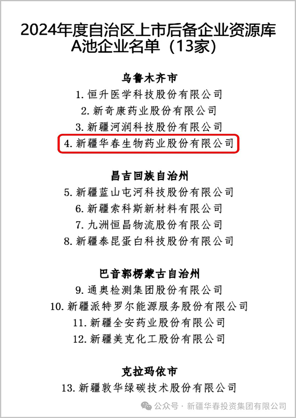 為優化充實新疆上市資源,提升自治區上市后備企業資源庫整體質量,培育更多優質企業赴多層次資本市場上市掛牌和融資,讓實體企業更好地參與和服務建設自治區“八大產業集群”,3月4日,自治區地方金融管理局公示了2024年度入庫上市后備企業名單,新疆華春生物藥業股份有限公司(簡稱華春藥業)又被列入后備企業資源庫A池。