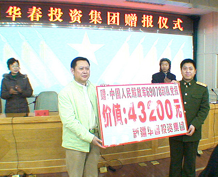 在數(shù)九寒天的1月11日,新疆華春投資集團有限公司為了能讓69078部隊的廣大官兵及時了解國內(nèi)外各個方面重大經(jīng)濟信息、學(xué)習(xí)掌握新疆市場經(jīng)濟動態(tài),以便能在今后市場經(jīng)濟的大潮中游刃有余,新疆華春投資集團出資現(xiàn)金43200元,訂購150份2008年全年度的《新疆經(jīng)濟報》,贈送給69078部隊的同志們,從而為新疆的軍民團結(jié)、為駐疆部隊軍地人才的培養(yǎng),奉獻出新疆華春投資集團的一片心力。