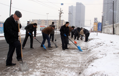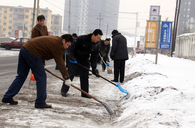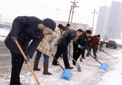 于第二天周六休息日,華春投資集團黨委組織全體黨員進行了新年的第一次義務勞動,掃除通往蘇杭明珠小區四平路上的積雪,為在這里上班的員工和小區居民提供了出行的方便。