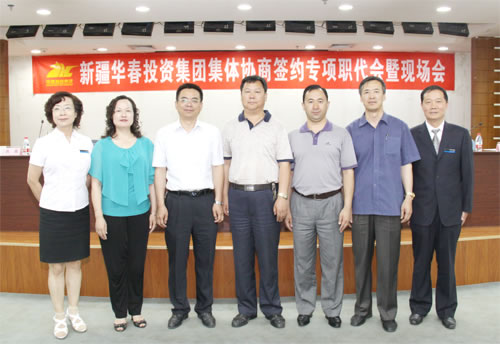 6月15日上午,烏魯木齊市高新區(qū)(新市區(qū))簽訂三項(xiàng)集體合同的重點(diǎn)示范企業(yè)——新疆華春投資集團(tuán)企業(yè)方代表周躍江和職工方代表高青簽訂了“三項(xiàng)合同”,即《集體合同》、《工資集體協(xié)議合同》和《女職工權(quán)益保護(hù)集體合同》,確保了員工的合法權(quán)益。圖為華春集團(tuán)勞資雙方代表合影。