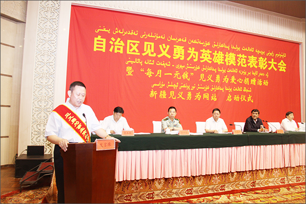 李成功總裁代表為自治區見義勇為事業作出突出貢獻的模范單位和個人在表彰大會上發言。他懷著感恩之情說:我們只是做了一點力所能及的事,自治區人民政府給予了我們這么高的榮譽,民營企業的發展,得益于黨的好政策、得益于和諧安定的社會環境。而正是這些見義勇為的英雄們,為今天和諧安定的社會,獻出了他們的鮮血和生命,使我們企業有了優美的發展環境,飲水思源,我們要把對見義勇為英雄們的敬仰之情,轉化為弘揚正氣、凝聚正能量、構建和諧社會的強大動力。企業要積極參與支持見義勇為事業、并回報社會,這是所有民營企業家義不容辭的社會責任!他倡議:希望有更多的民營企業家和社會有識之士,以勇于擔當的時代精神,積極投身于見義勇為事業,慷慨解囊,用實際行動真誠關心、愛護見義勇為者,決不讓為社會安定、人民幸福而流血的見義勇為英雄們流血又流淚、傷身又傷心。形成全社會都來關心、支持見義勇為事業、弘揚見義勇為精神的良好局面,為新疆的跨越式發展和長治久安做出應有的貢獻!讓我們攜起手來,共同激發起全社會的正能量,弘揚正氣,為正義之火添柴加薪!