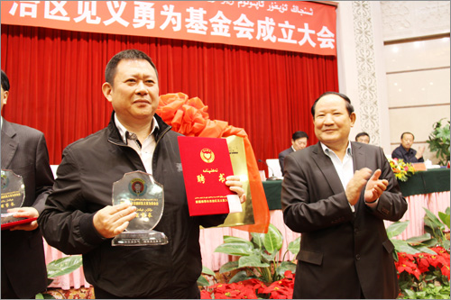 自治區見義勇為基金會成立大會于2012年10月19日上午在新疆人民會堂多功能廳隆重舉行,新疆華春投資集團董事局主席兼總裁李成功先生當選自治區見義勇為基金會首屆理事會副理事長,自治區副主席、政法委副書記賈帕爾•阿比布拉為李總裁頒發了副理事長證書和座牌。